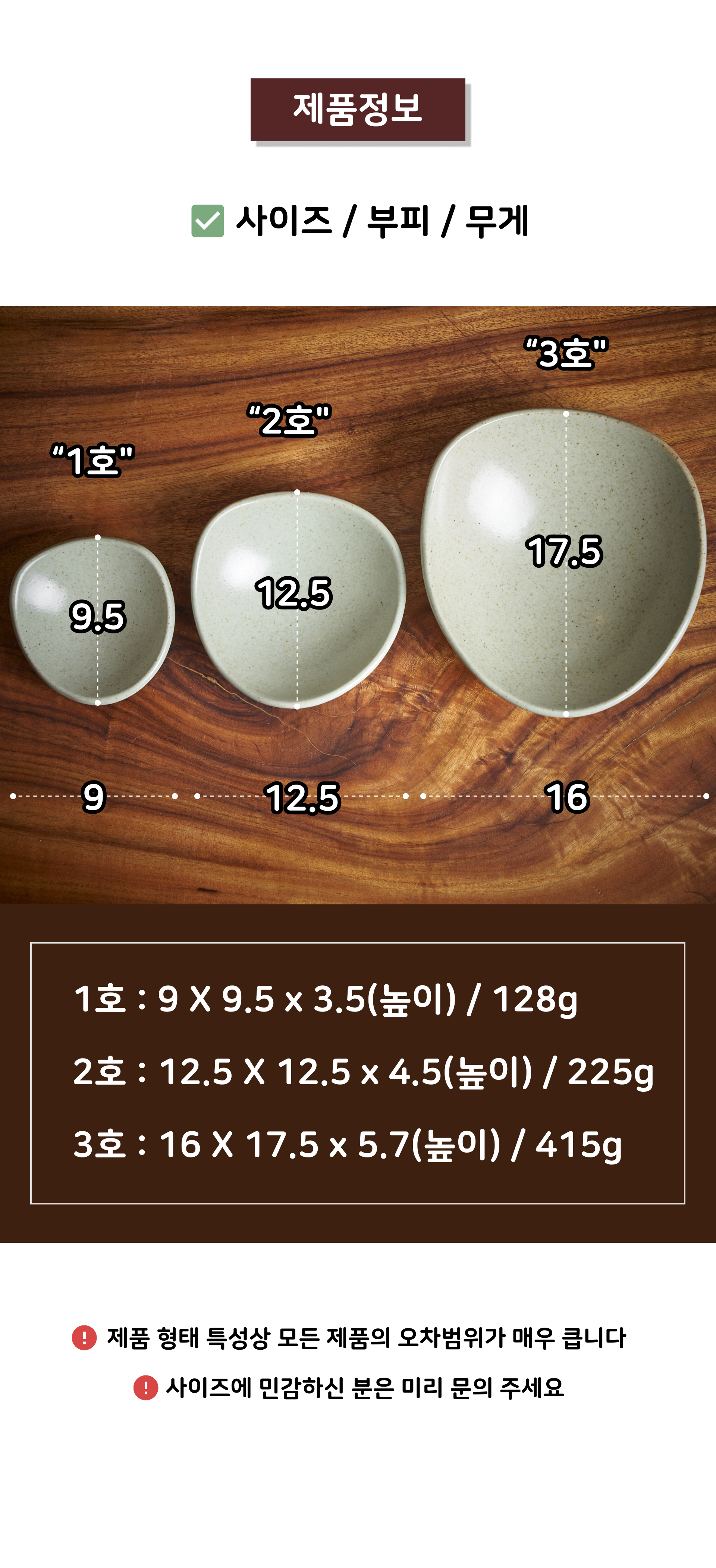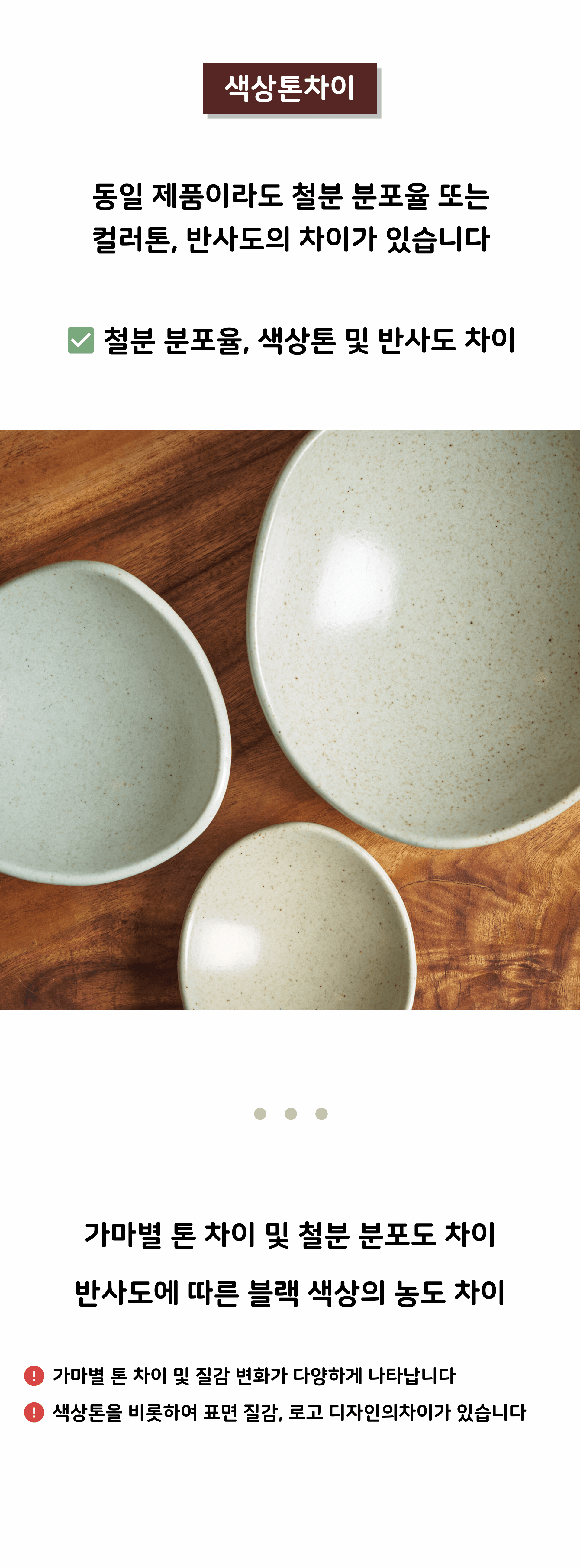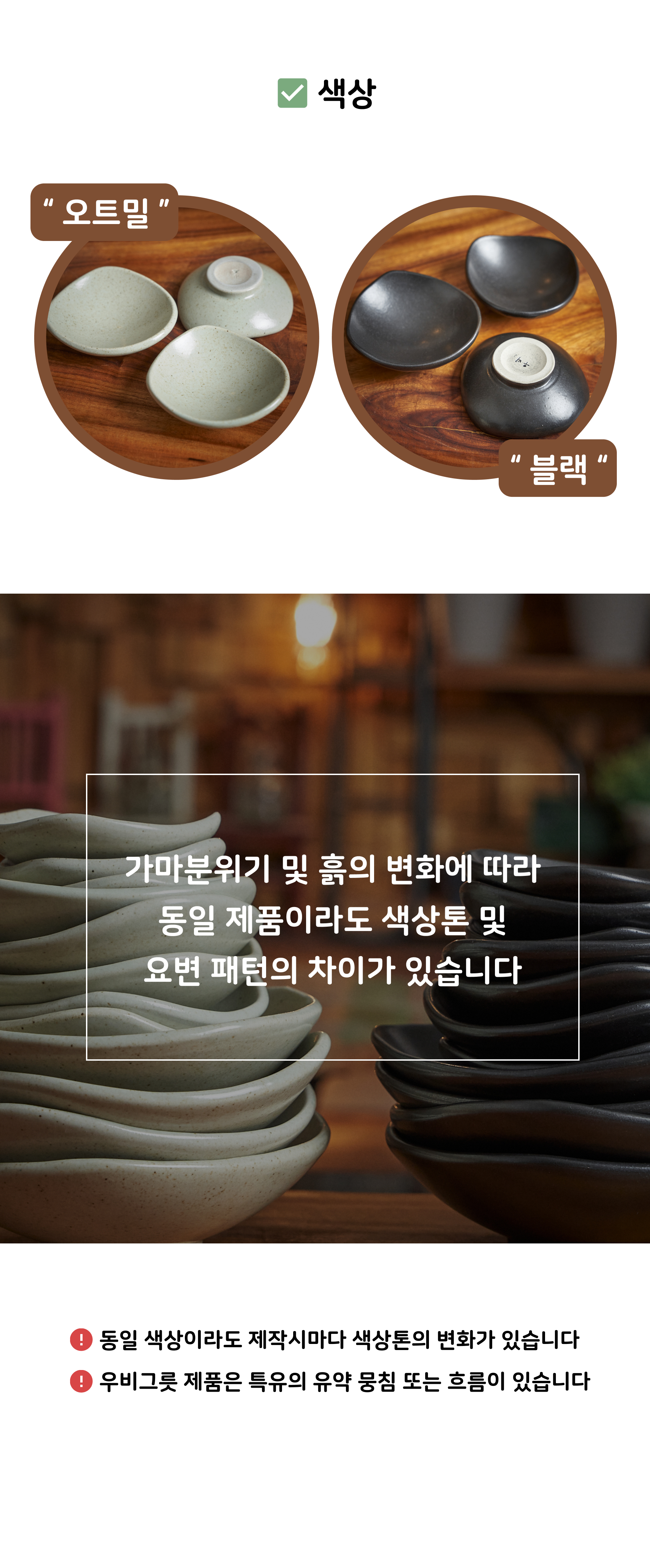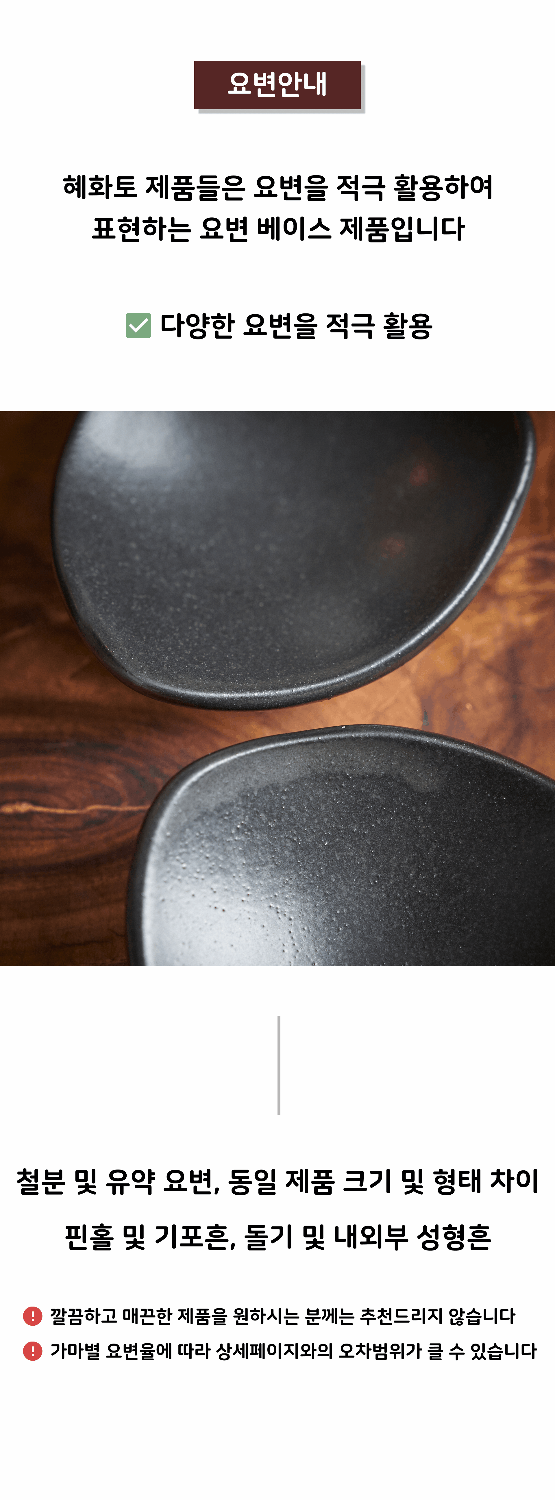 - 가마에서 나올때마다 차이가 있으니, 기계 공산품처럼 깔끔하고 딱 떨어지는 제품을 원하시는 분들께는 구매를 추천드리지 않습니다.