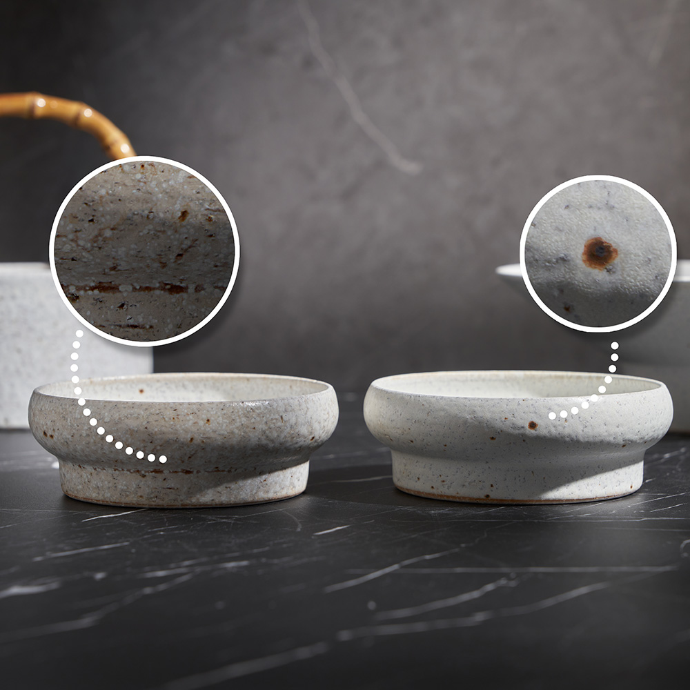 ![]() | 크기 및 형태 차이 사진과 같이 동일 제품이라도 크기 및 높낮이, 형태 차이가 있습니다. 도자기 그릇은 같은 크기와 형태로 만들어 초벌 작업을 해도, 가마에서 구워질때의 위치에 따라 다양한 변수가 생기게 됩니다. 이러한 변화와 더불어 수축과 팽창을 반복하며 최종 형태가 나오기 때문에, 크기 및 형태의 오차범위가 생기게 됩니다. | ||