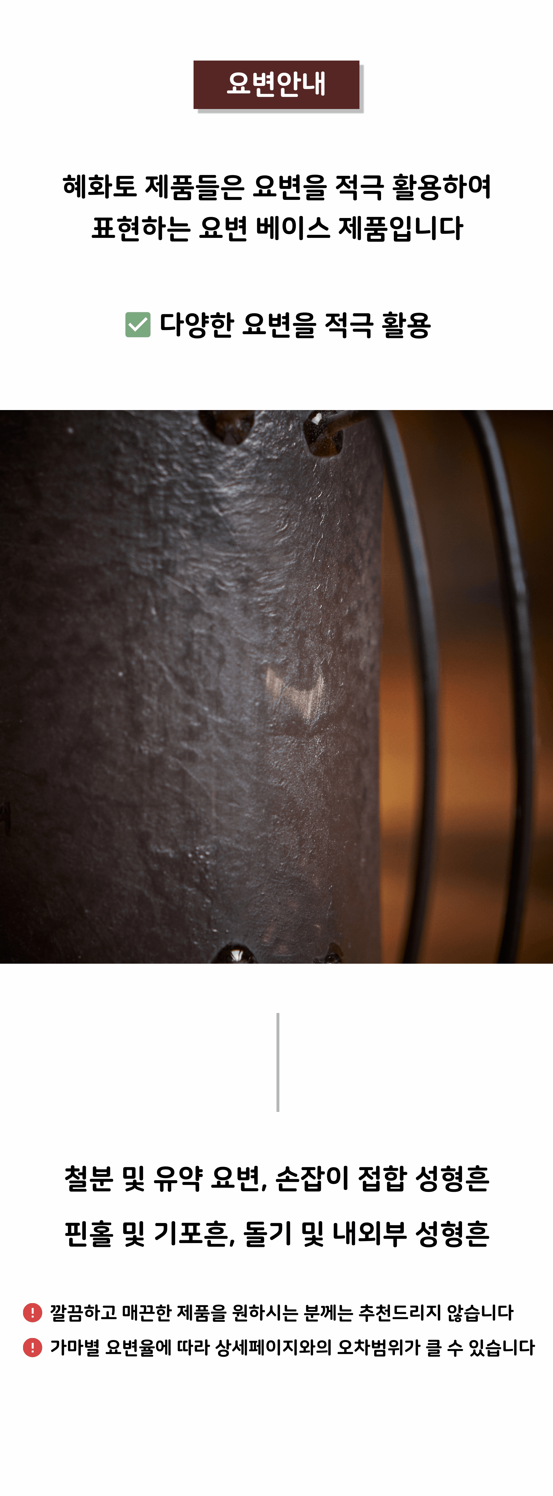 | 핸드메이드 도자기 그릇은 일반적인 공산품과 다릅니다. 가마의 분위기, 매번 달라지는 흙의 속성, 유약의 미세한 비율등 셀 수 없는 많은 요소로 인하여 끊임없이 요변이 일어나는 것이 핸드메이드 도자기 입니다. 상세 페이지와 다른 색상톤, 철분점과 돌기, 기포자국, 물레 형성자국, 가마에 닿는 바닥면의 흠집, 색배임 등등 핸드메이드 그릇 고유의 특징에 대하여 민감하신 분은 구매전 다시 한 번 고려하여 주시기 바랍니다. 온라인 쇼핑몰 특성상 사진이 본래의 제품과 100% 똑같이 나온다고 말씀드릴 순 없습니다. 항상 실제 제품과 같아 보이도록 최선을 다하고 있지만, 촬영 당시의 한 두개의 모델로 촬영된 제품과 꾸준히 생산되며 재입고되는 제품들은 요변에 따라 차이점이 날 수 밖에 없음을 이해해 주시기 바랍니다. 또한, 제품을 검색하는 모니터, 핸드폰의 종류에 따라서도 색상의 차이가 달라지니 이 점 참고하시기 바랍니다. |