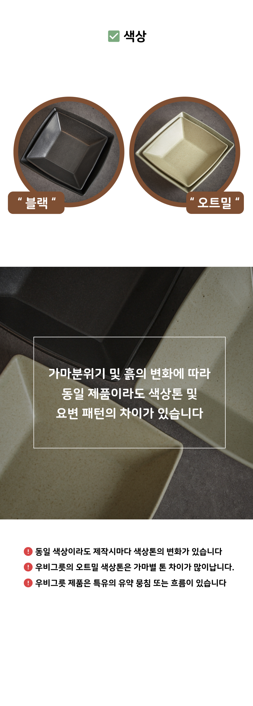 - 가마에서 나올때마다 차이가 있으니, 기계 공산품처럼 깔끔하고 딱 떨어지는 제품을 원하시는 분들께는 구매를 추천드리지 않습니다.
