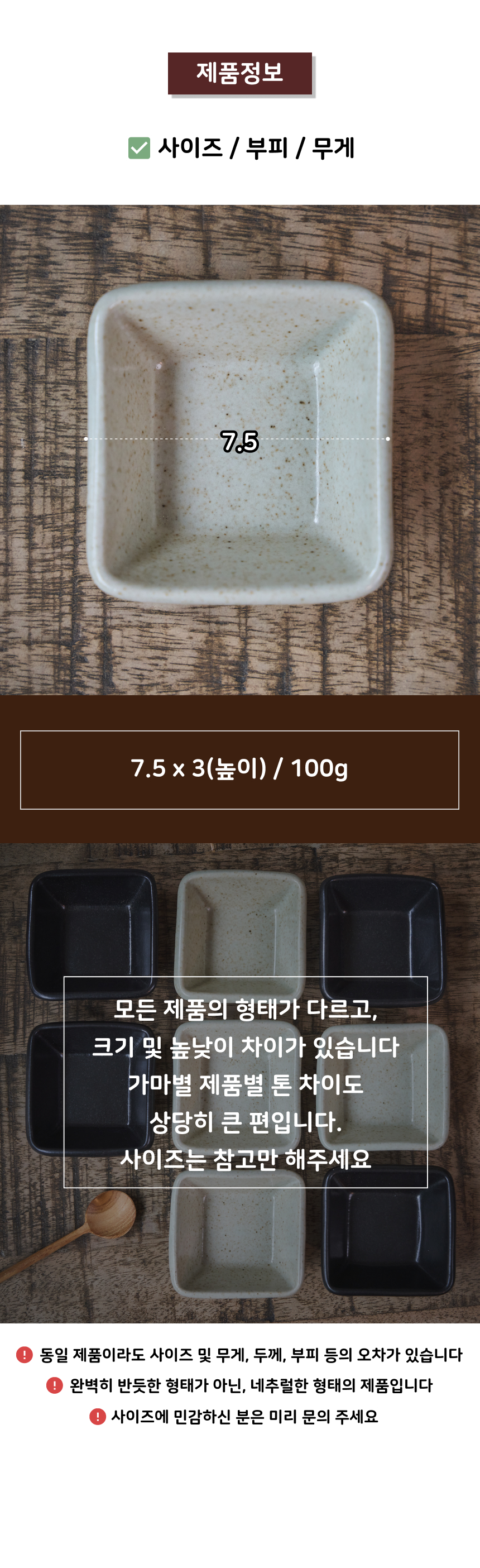 - 가마에서 나올때마다 차이가 있으니, 기계 공산품처럼 깔끔하고 딱 떨어지는 제품을 원하시는 분들께는 구매를 추천드리지 않습니다.