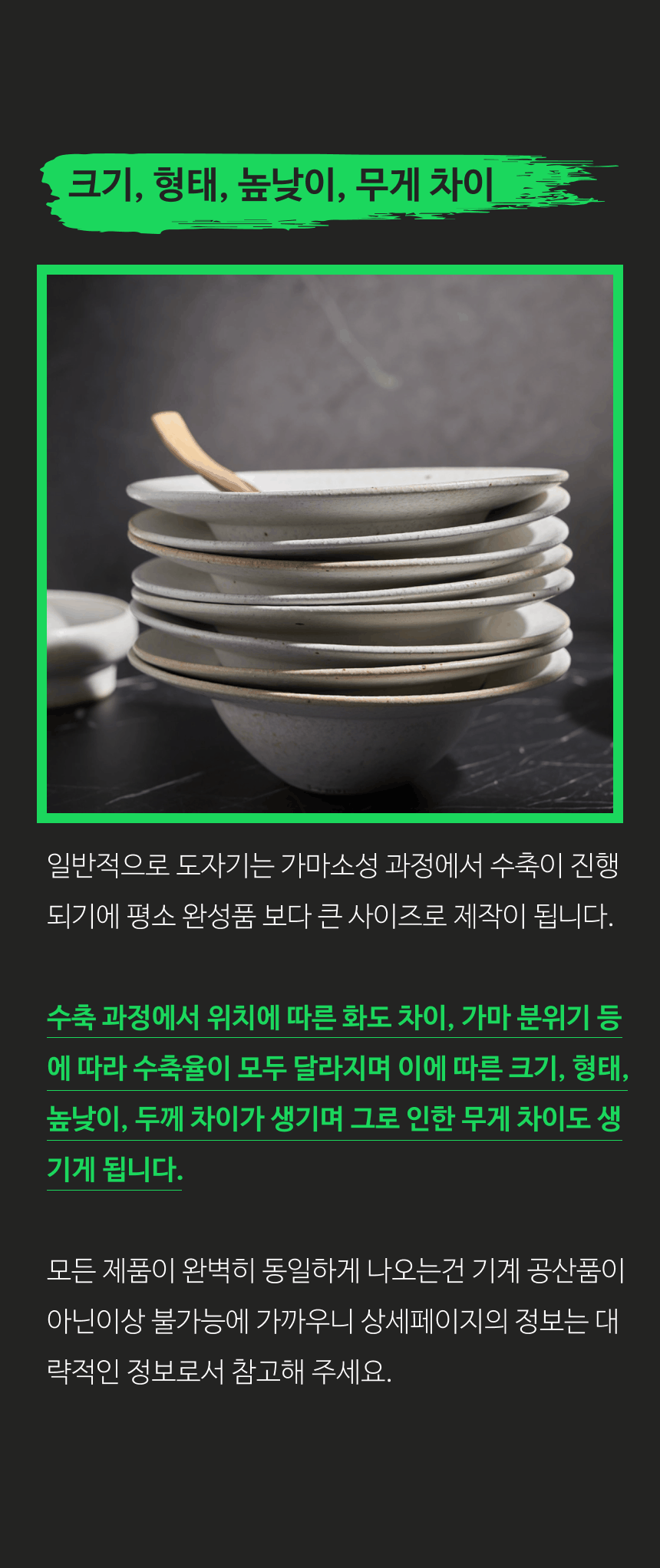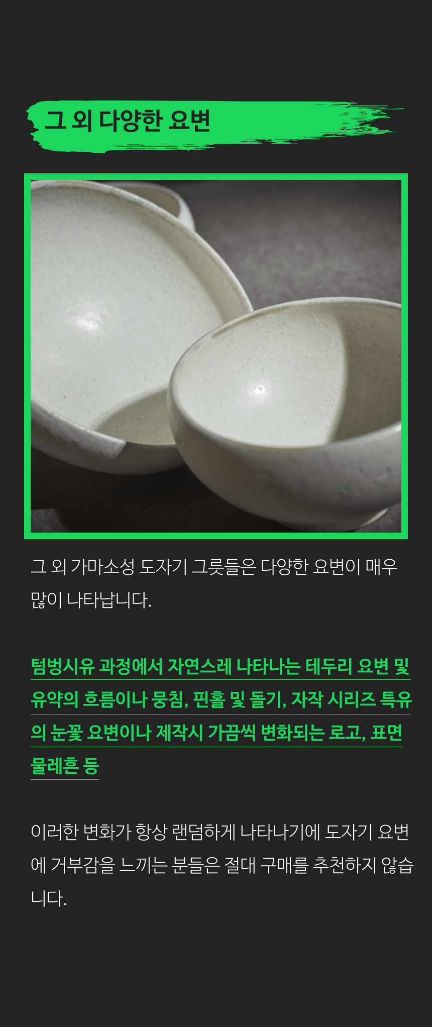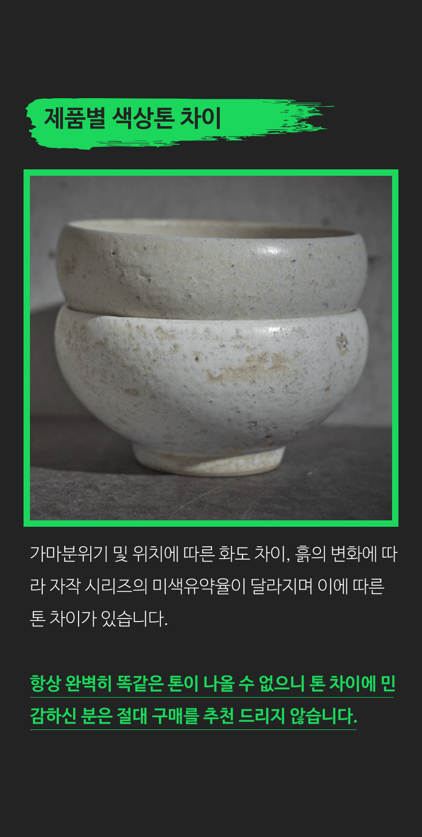 - 가마에서 나올때마다 차이가 있으니, 기계 공산품처럼 깔끔하고 딱 떨어지는 제품을 원하시는 분들께는 구매를 추천드리지 않습니다.