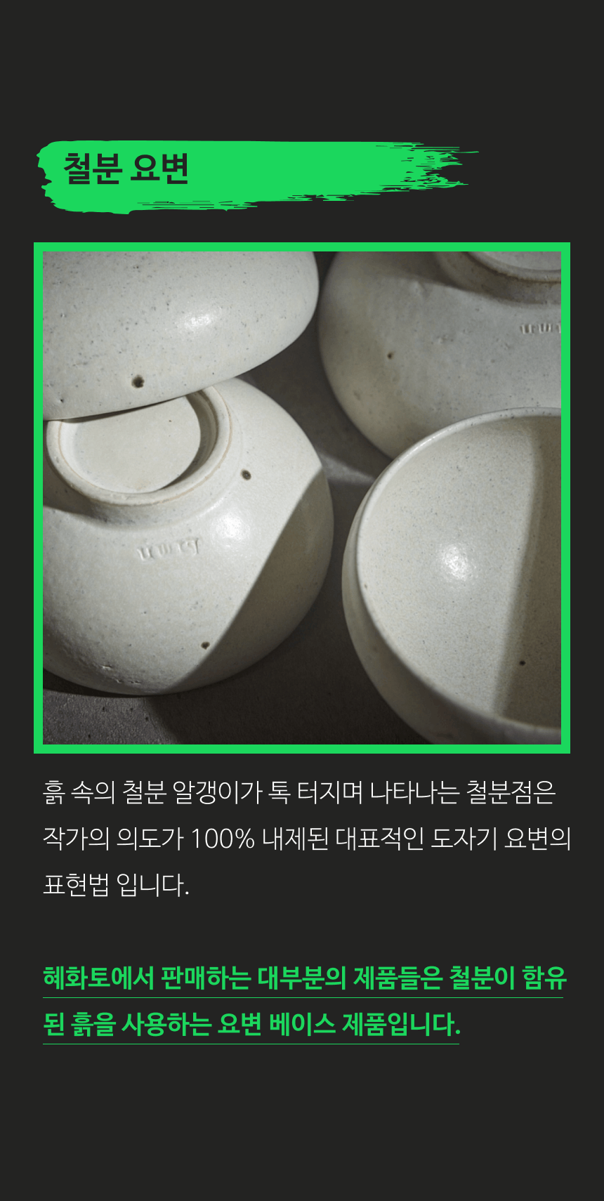 | 핸드메이드 도자기 그릇은 일반적인 공산품과 다릅니다. 가마의 분위기, 매번 달라지는 흙의 속성, 유약의 미세한 비율등 셀 수 없는 많은 요소로 인하여 끊임없이 요변이 일어나는 것이 핸드메이드 도자기 입니다. 상세 페이지와 다른 색상톤, 철분점과 돌기, 기포자국, 물레 형성자국, 가마에 닿는 바닥면의 흠집, 색배임 등등 핸드메이드 그릇 고유의 특징에 대하여 민감하신 분은 구매전 다시 한 번 고려하여 주시기 바랍니다. 온라인 쇼핑몰 특성상 사진이 본래의 제품과 100% 똑같이 나온다고 말씀드릴 순 없습니다. 항상 실제 제품과 같아 보이도록 최선을 다하고 있지만, 촬영 당시의 한 두개의 모델로 촬영된 제품과 꾸준히 생산되며 재입고되는 제품들은 요변에 따라 차이점이 날 수 밖에 없음을 이해해 주시기 바랍니다. 또한, 제품을 검색하는 모니터, 핸드폰의 종류에 따라서도 색상의 차이가 달라지니 이 점 참고하시기 바랍니다. |
