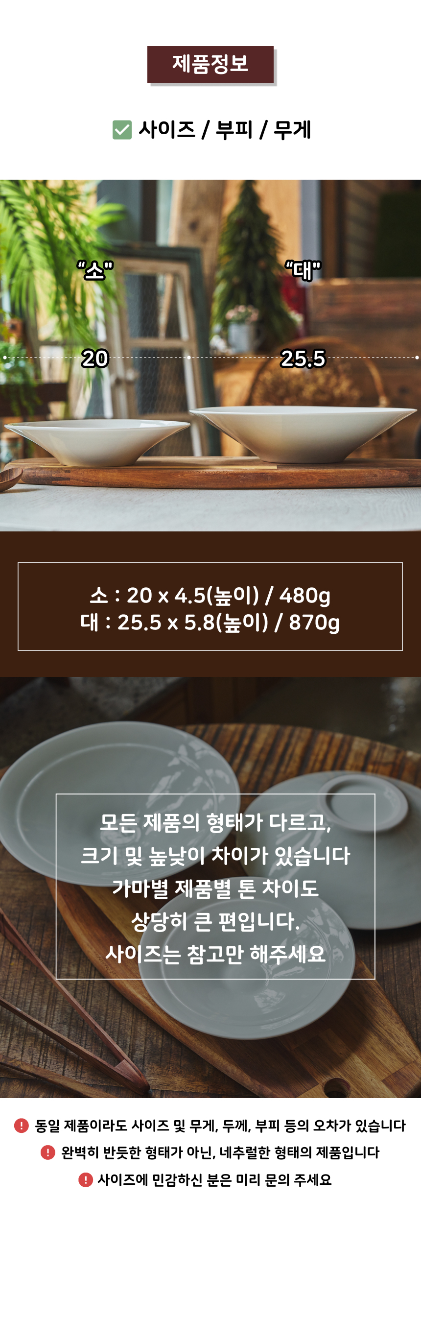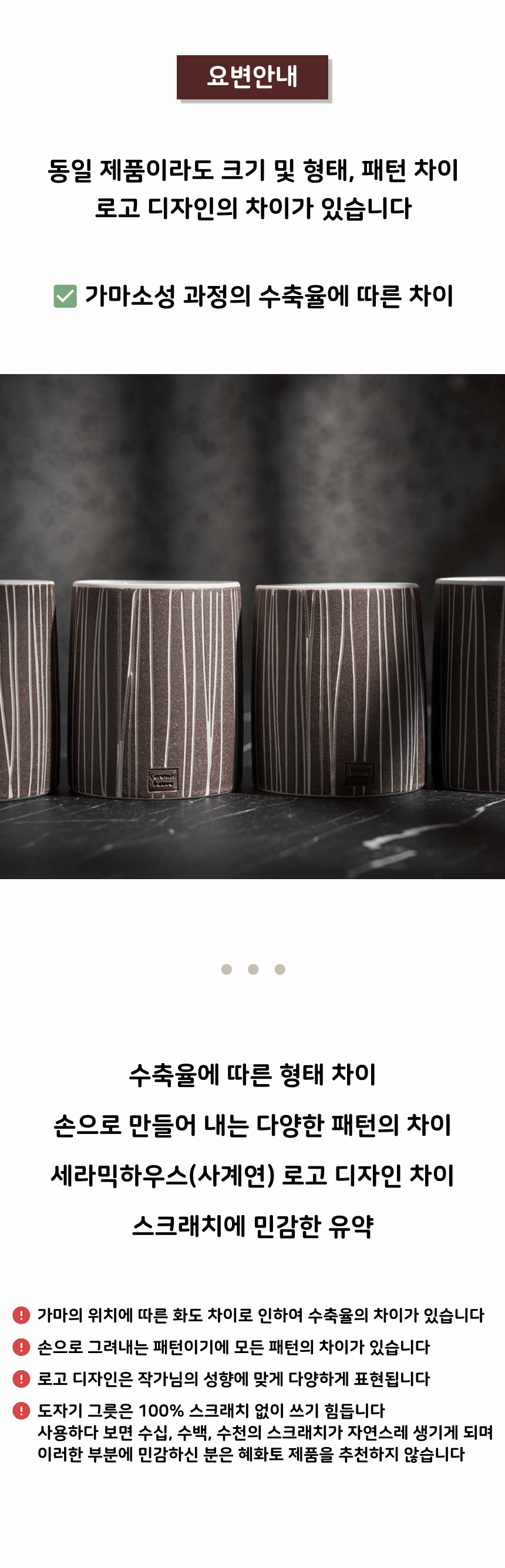 - 가마에서 나올때마다 차이가 있으니, 기계 공산품처럼 깔끔하고 딱 떨어지는 제품을 원하시는 분들께는 구매를 추천드리지 않습니다.