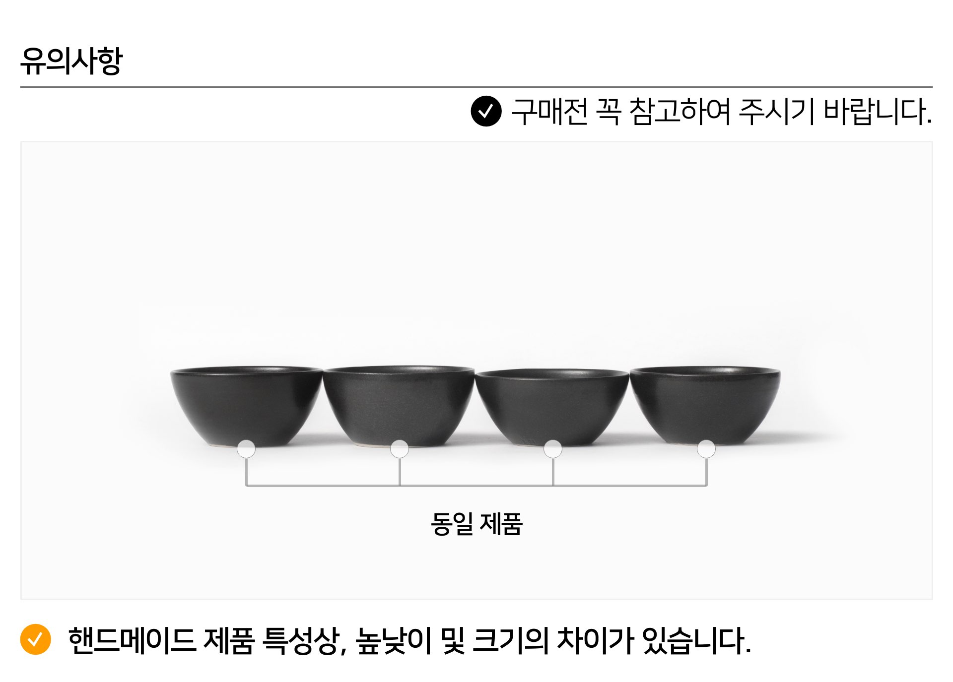 | 핸드메이드 도자기 그릇은 일반적인 공산품과 다릅니다. 가마의 분위기, 매번 달라지는 흙의 속성, 유약의 미세한 비율등 셀 수 없는 많은 요소로 인하여 끊임없이 요변이 일어나는 것이 핸드메이드 도자기 입니다. 상세 페이지와 다른 색상톤, 철분점과 돌기, 기포자국, 물레 형성자국, 가마에 닿는 바닥면의 흠집, 색배임 등등 핸드메이드 그릇 고유의 특징에 대하여 민감하신 분은 구매전 다시 한 번 고려하여 주시기 바랍니다. 온라인 쇼핑몰 특성상 사진이 본래의 제품과 100% 똑같이 나온다고 말씀드릴 순 없습니다. 항상 실제 제품과 같아 보이도록 최선을 다하고 있지만, 촬영 당시의 한 두개의 모델로 촬영된 제품과 꾸준히 생산되며 재입고되는 제품들은 요변에 따라 차이점이 날 수 밖에 없음을 이해해 주시기 바랍니다. 또한, 제품을 검색하는 모니터, 핸드폰의 종류에 따라서도 색상의 차이가 달라지니 이 점 참고하시기 바랍니다. |